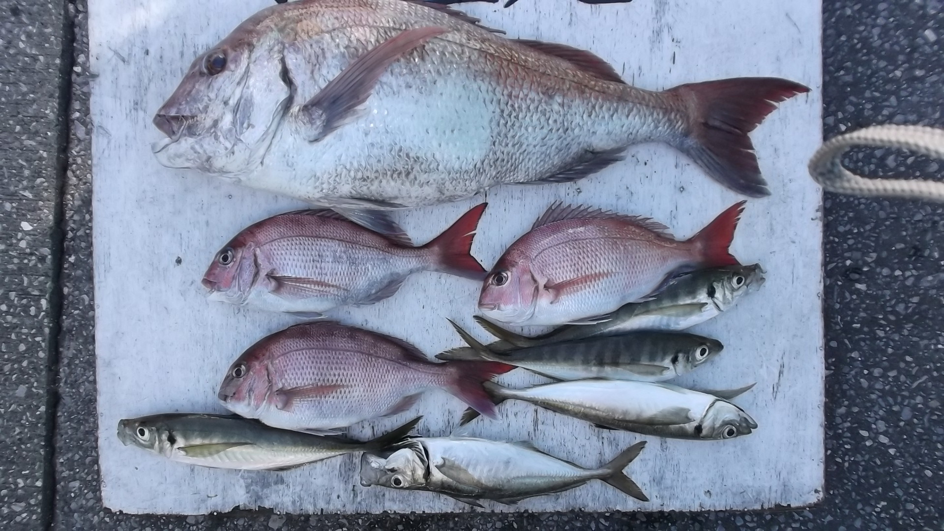 マダイ乗合船 真鯛 0.6~7.05k 1~4枚 3枚2名 外道 アジ・ウマズラ 久里浜沖40m 本日は朝から好調に当たり、TOP4枚で最大7kと久々に坊主もなく好調でした!1k台が主体と全体的な型も良く、5名で船中13枚!! バラシやハリス切れも有りましたので、明日も期待して頑張ります! 外道のアジも30cm前後と良型で、全員釣れました。 五目船 本日は出船なし 投稿ナビゲーション 7月20日(月) 7月22日(水)