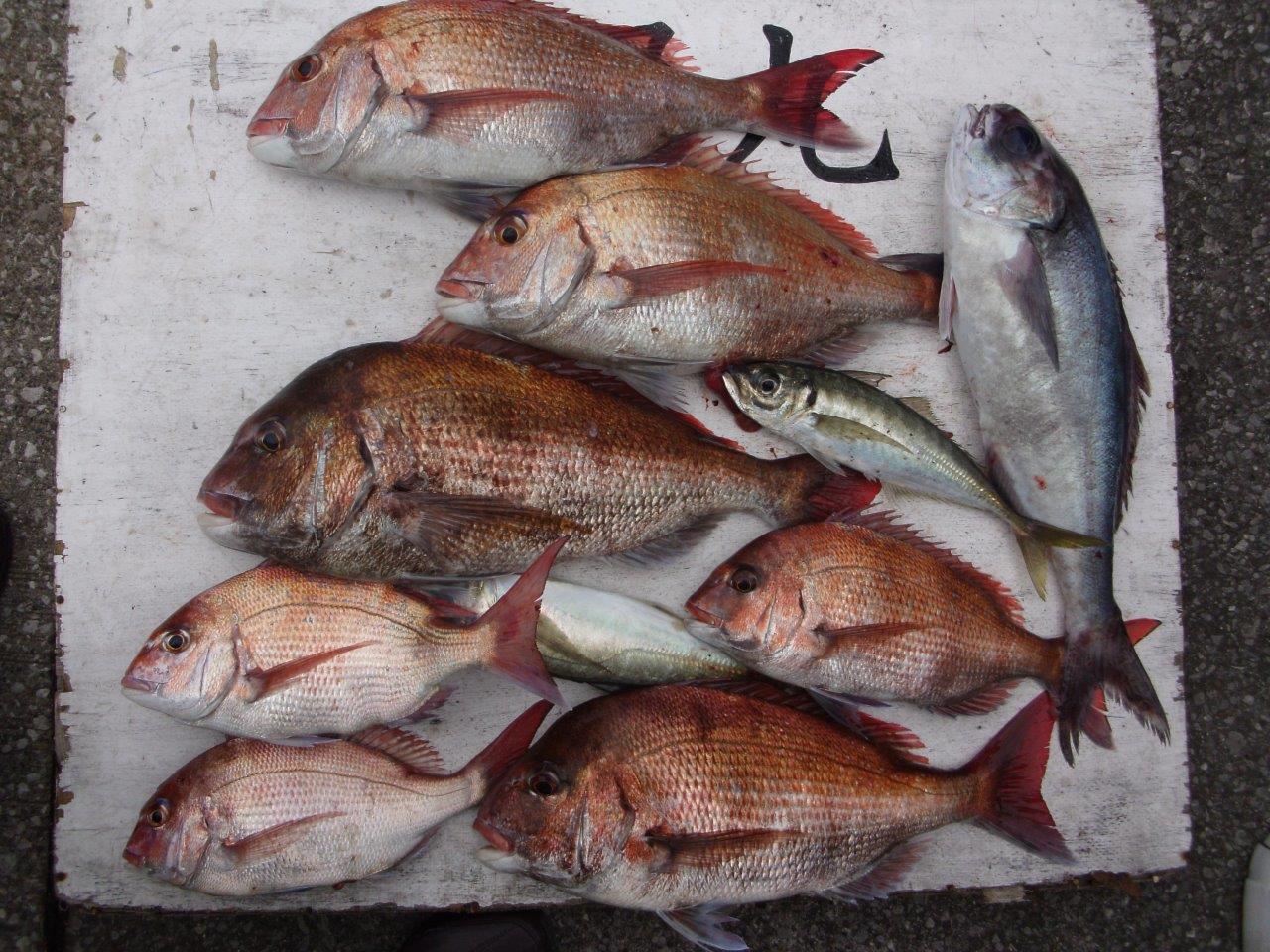 マダイ乗合船 真鯛 0.6~3.1k 1~7枚 2番手4枚・3番手3枚 外道 アジ・サバ・メダイ 久里浜沖50~90m 本日も潮変わりに当たりが集中し、アジ・サバ混じりで上記の様に平均して釣れました。サイズも1.5k前後の良型主体と型が揃っていました! バラシも多く有りましたので、明日も期待して出船します!! 外道のメダイは1.8~3.0k、0~1枚。 投稿ナビゲーション 02月22日(月) 02月24日(水)