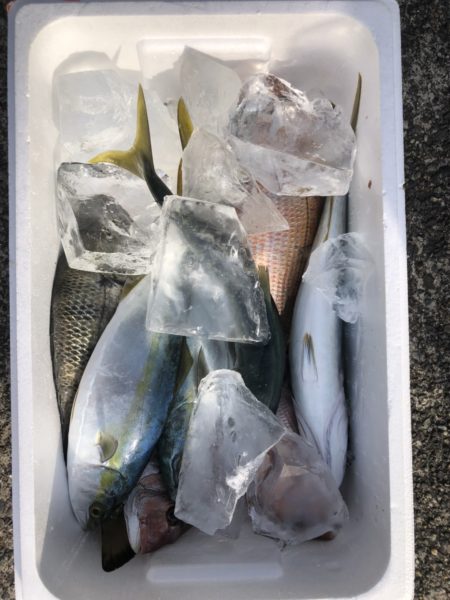 本日は潮の流れる時間帯に当たりが有りました。朝はイナダが全員に釣れ、後半はクロダイ混じりで真鯛が釣れました!