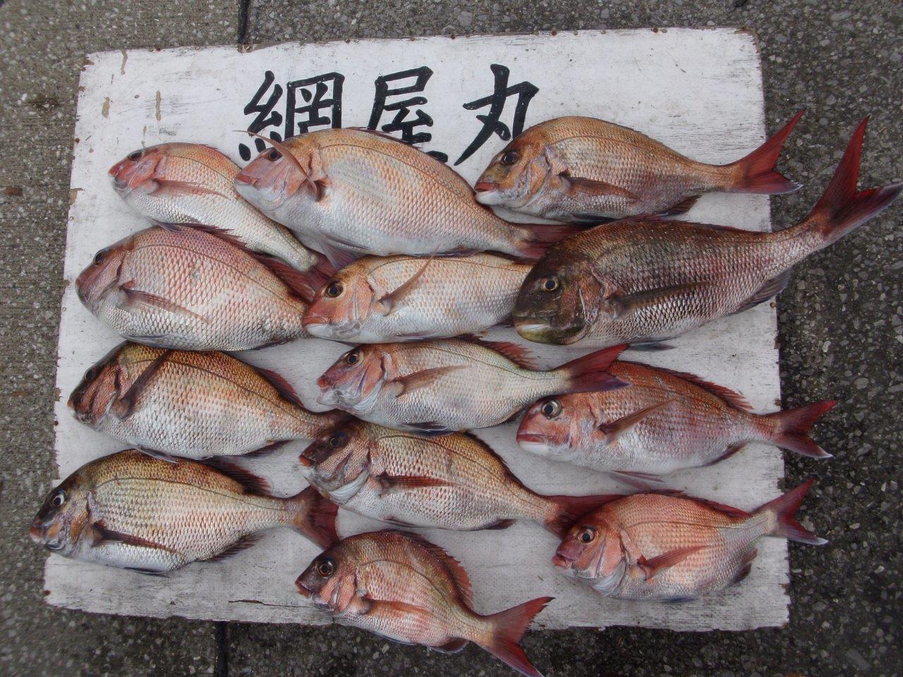 マダイ乗合船 真鯛 0.4~1.8k、0~3枚 2枚2名・0は1名 外道 メジナ・アジ・サバ 久里浜沖40~60m 本日は平均的に当たりが有りました。バラシも有りましたので明日も期待して頑張ります。 下記の写真は仕立て船の写真!こちらは朝から好調に釣れ、TOP13枚と下記の様な好釣果でした! 投稿ナビゲーション 04月24日(日) 04月26日(火)