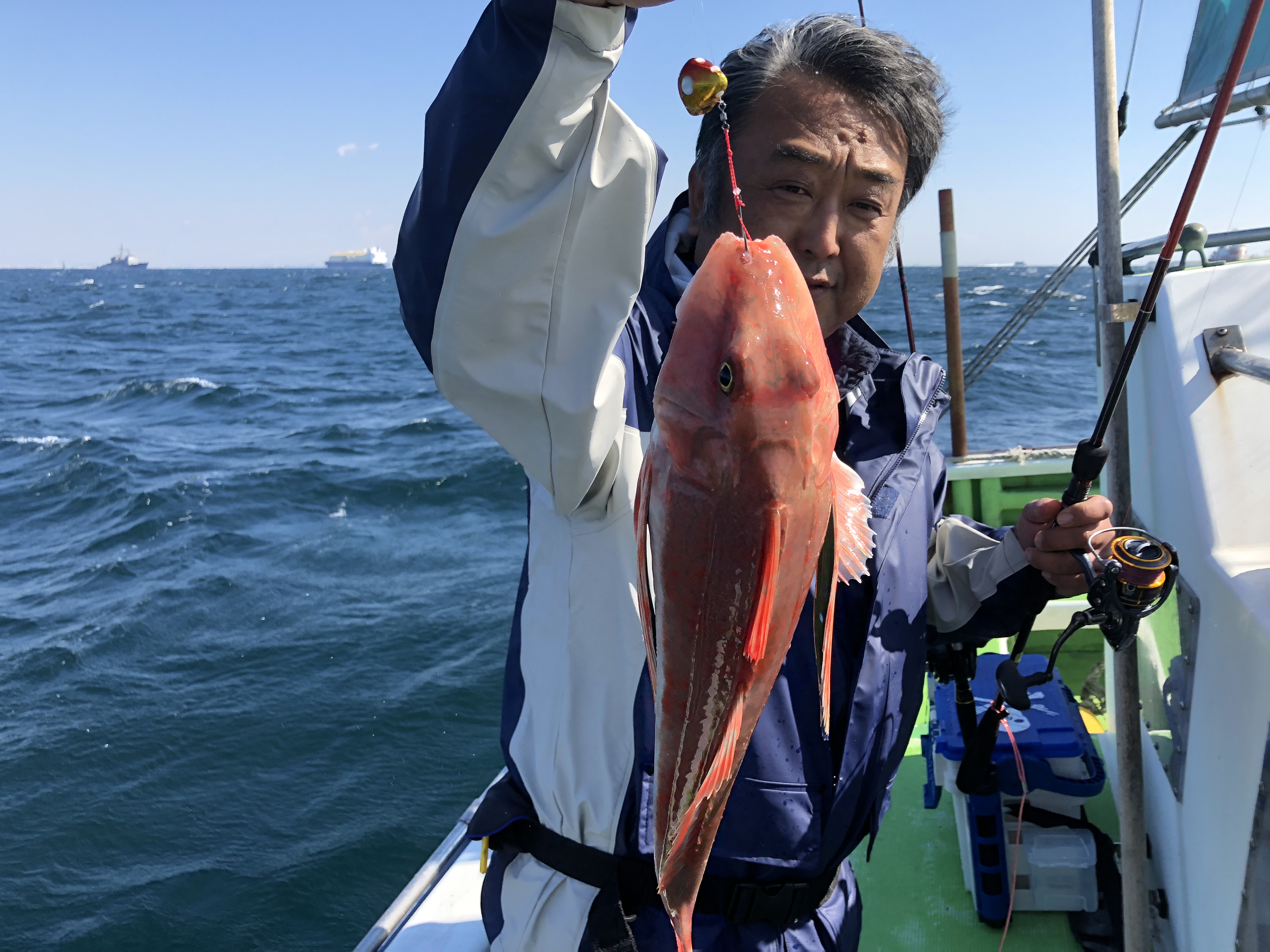 本日は朝から南風が強い状態での出船となりました!真鯛は朝の流しでは当たりが出なく心配しましたが、その後に移動した場所で直ぐに型が出て、外道のホウボウ混じりで潮の流れている時間に当たりが有りました!南風が昼頃強くなり、12時ごろに早上がりしました。明日も出船予定なので、今日の場所を中心に探りたいと思います。テンヤの重さは15号、タイラバはグリーン系の方が釣れました!