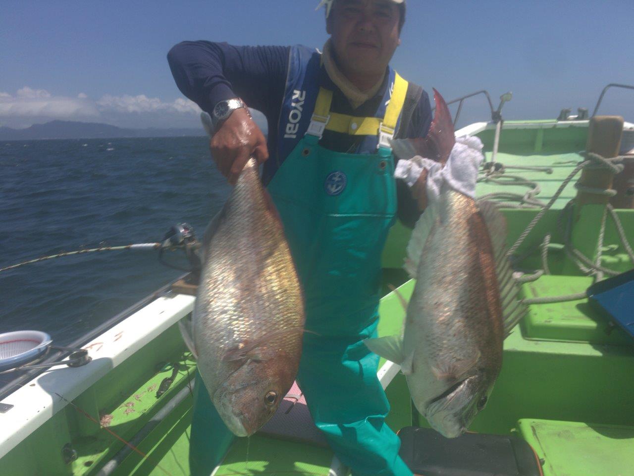 マダイ乗合船 真鯛 0.5~5.5k、2~2枚 5.4kも 外道 アジ・サバ 久里浜沖40m 本日は開始早々に大きな当たりが有り、5.4kをGET! その後はアジや小振りなタイが釣れ、最後に本日最大の5.5kが釣れました! 下記の写真の通りに、同じお客様が5kオーバー2枚釣れました。 投稿ナビゲーション 07月12日(水) 07月15日(土)