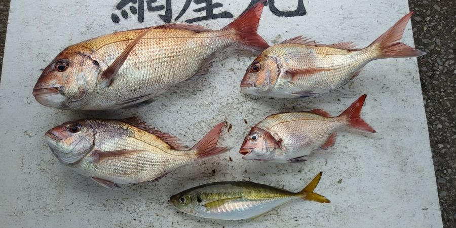 本日は反応も多くアジが多く混じりました。真鯛は潮の流れる時間帯に当たりが有り、3.8kや2.4kもつれサイズも揃ってました!