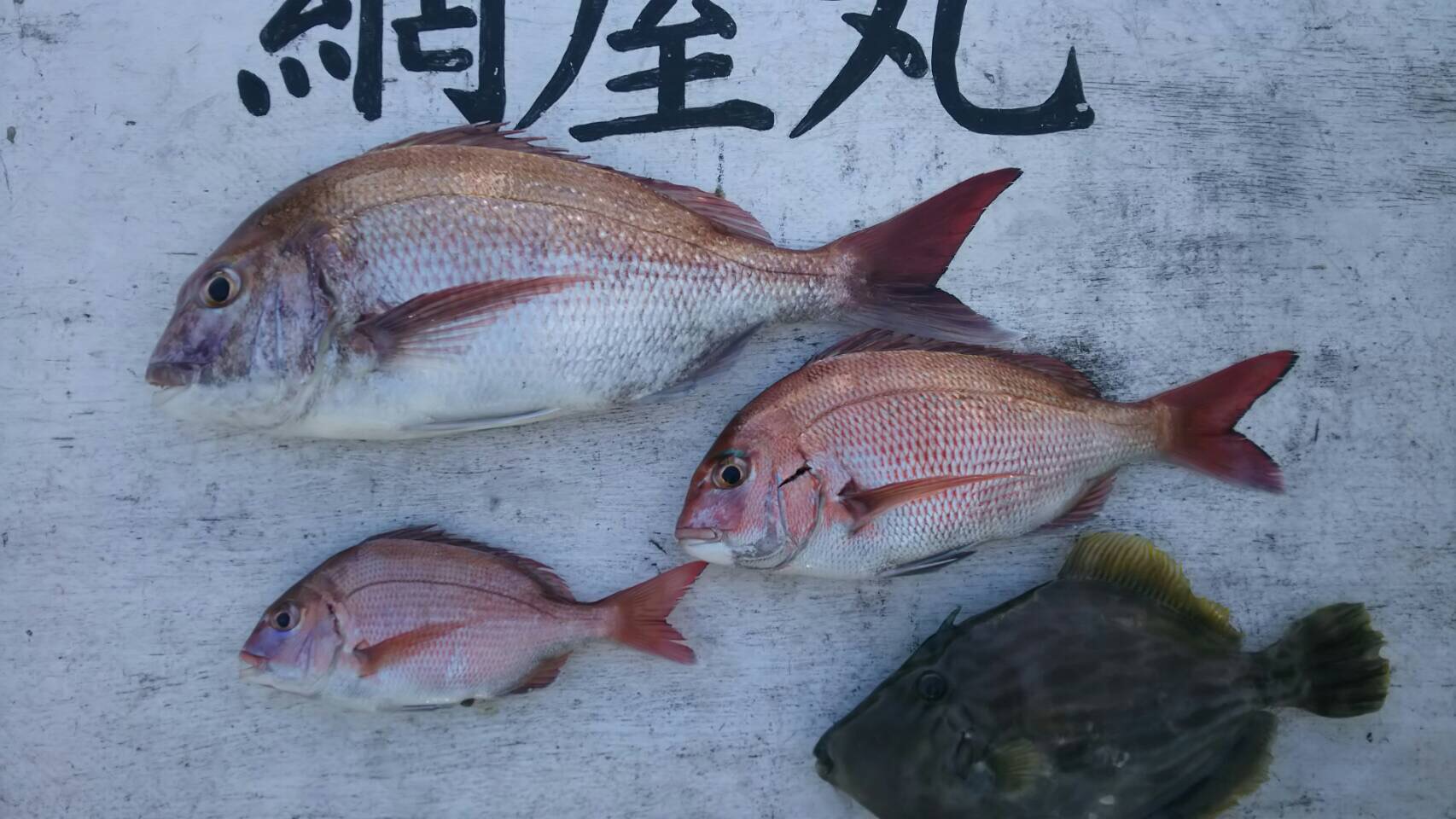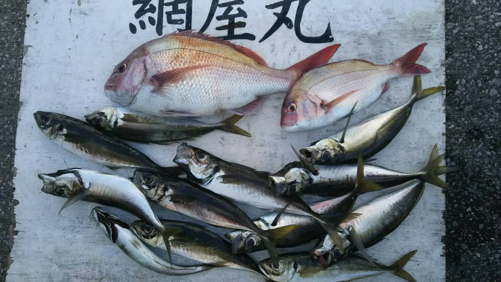 本日は北風が強く釣り辛い一日でしたが、真鯛は4.6kを筆頭に2k台も混じり、昨日よりは食いが立ちました!途中に深場に行き、35cm前後の大アジが下記の写真の様に、多く混じりました!