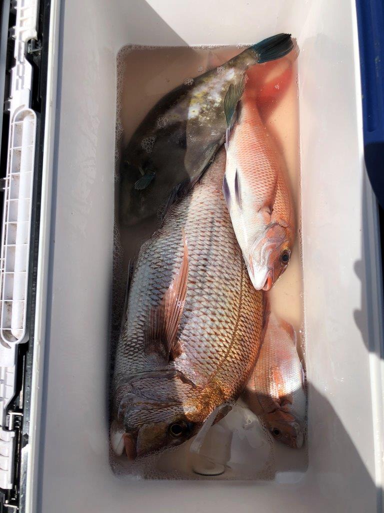 本日は天気予報が外れて朝から晴天で風もなく釣りやすい一日でした!真鯛は潮代わりを中心に当たりが有り、0は1名でした。