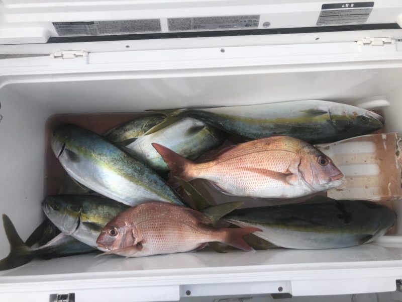 本日も朝はイナダがコンスタントに当たりました。真鯛は小振りながら潮の流れる時間帯に当たりました。イナダは3~7本。