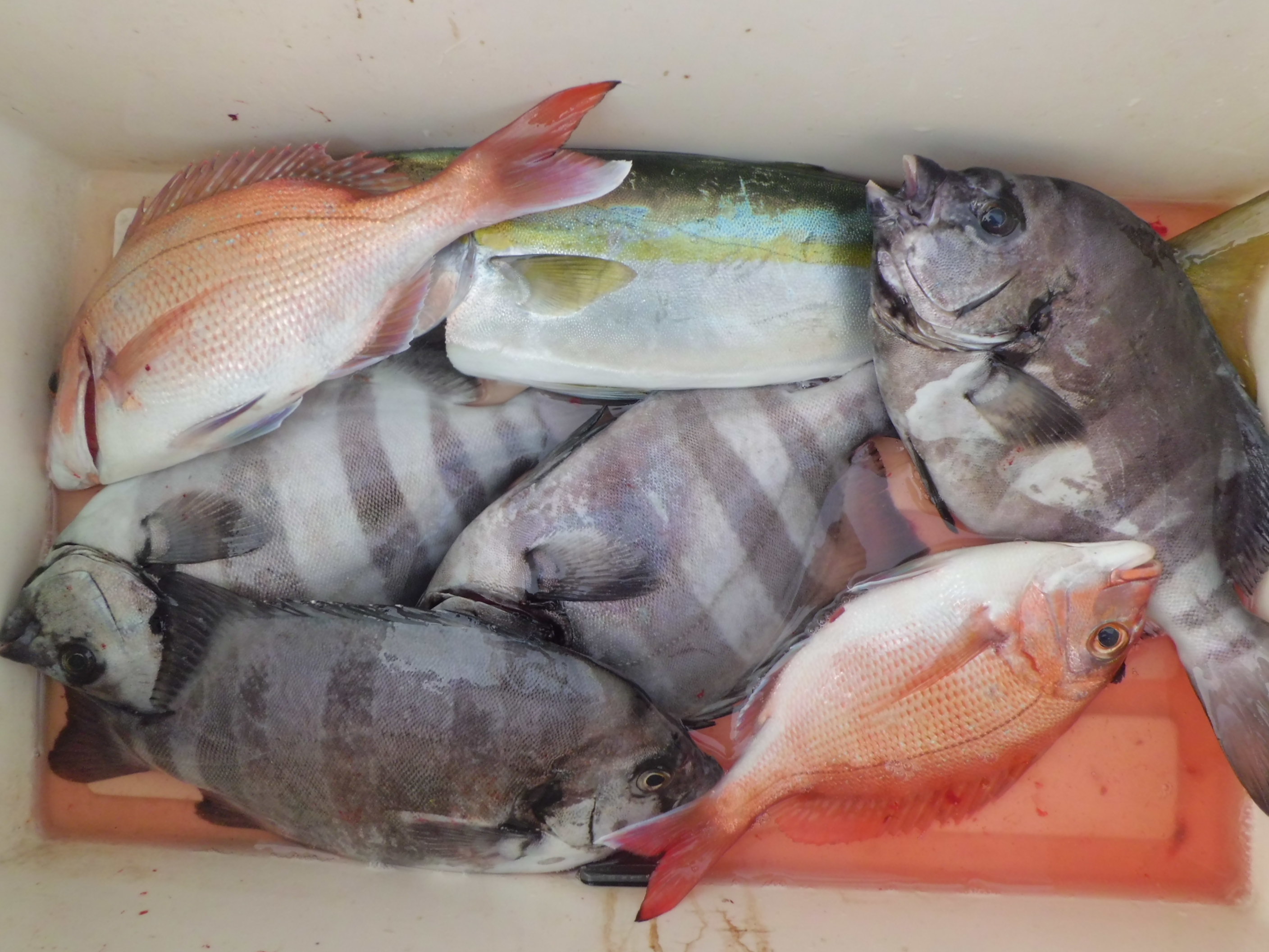 マダイ乗合船 真鯛 0.3~1.0k 0~3枚 3枚2名・2枚3名で0は1名 外道 イナダ・アジ・ショウサイフグ イシダイ0.5~1.0k、0~4枚 久里浜沖30~40m 朝からイシダイやアジ混じりで当たりが有りましたが、当たりが続かず、TOP3枚と数が伸びませんでした。大型のハリス切れやバラシも有りましたので、明後日も期待して頑張ります! 投稿ナビゲーション 10月31日(土) 11月02日(月)