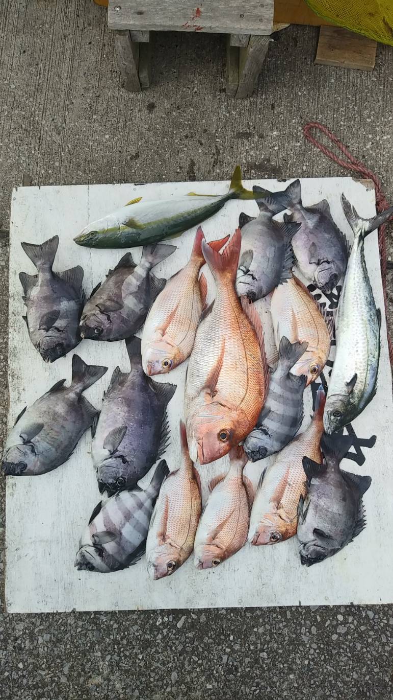 本日は朝からイシダイ混じりで食いが立ち、真鯛はTOP6枚が2名でイシダイはTOP12枚と絶好調でした!真鯛は1~1.5kくらいの良型が多く釣れ、ハリス切れや大型のバラシも有りました!最近ハリス切れが多いので、ハリスは4号をご使用ください。