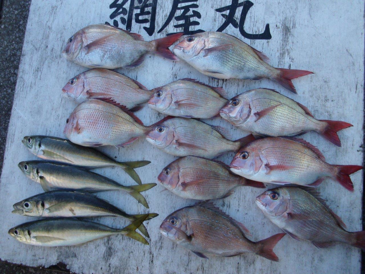 マダイ乗合船 真鯛 0.4~1.5k 0~11枚 2番手7枚・0は1名 外道 サバ・アジ 久里浜沖60m 本日も朝と潮代わりに当たりが集中し、上記の様な好釣果になりました!サイズは600g前後が中心ですが、大型のハリス切れバラシも有りましたので、年末年始も期待大です!! 年内は休まず営業します! 新年は2日より出船致します。 投稿ナビゲーション 12月24日(木) 12月27日(日)