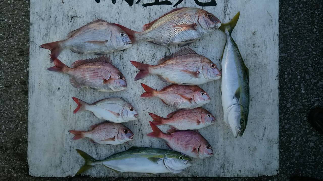 マダイ乗合船 真鯛 0.4~1.6k 2~9枚 5枚3名 外道 イナダ0~2本 サバ・アジ・カイワリ・オキアジ 久里浜沖30~40m 本日はコンスタントに当たりが有り、TOP9枚で船中33枚と好調でした!ハリス切れやバラシも多くありましたので、明日も期待して頑張ります! 下記の写真は別船(仕立て船での釣果)2k超えも混じり、TOP11枚でした! 投稿ナビゲーション 9月27日(日) 9月29日(火)