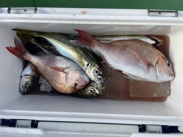 後半のポイント移動後はイナダやアジが上がりましたが、真鯛の追加はできず終了となりました。