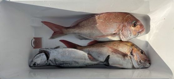 風が少し落ち着いたタイミングで、散発的ながら真鯛が顔を見せてくれましたが、惜しくもバラシもあり悔しい結果に…。